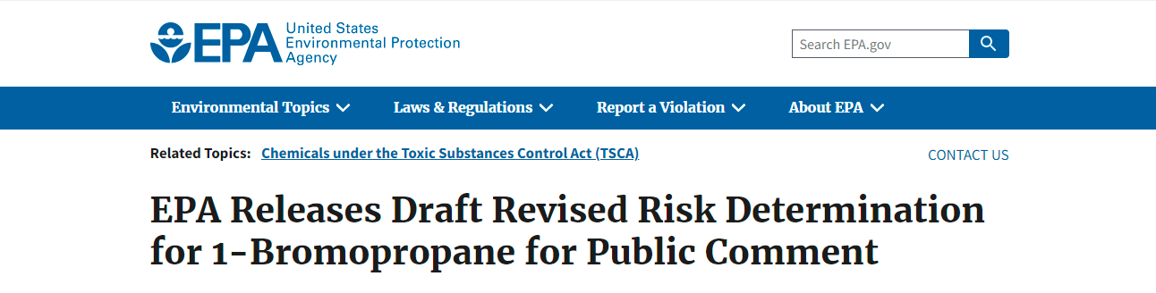 2022年7月20日,據(jù)美國有毒物質控制法案(TSCA)第6(b)條,美國環(huán)境保護署(EPA)發(fā)布1-溴丙烷風險評估修訂草案,以征詢公眾意見。修訂后的風險評估草案指出,1-溴丙烷存在使用條件下對人類健康造成不合理傷害風險。