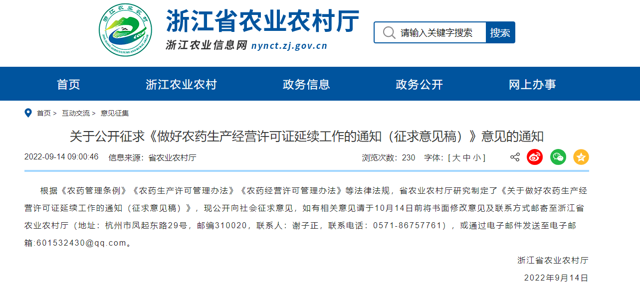 目前,浙江省部分農藥生產許可證和經營許可證5年有效期即將屆滿,將陸續進入延續換證期。為依法依規做好農藥許可延續換證工作,切實保護市場主體利益,浙江省農業農村廳于2022年9月14號在浙江農業信息網上發布了關于公開征求《做好農藥生產經營許可證延續工作的通知(征求意見稿)》意見的通知,并起草了《關于做好農藥生產經營許可證延續工作的通知》文件。申請單位可在浙江政務服務網進行網上申請,并選擇結果送達方式,或向省農業農村廳辦證中心提交申請材料。
