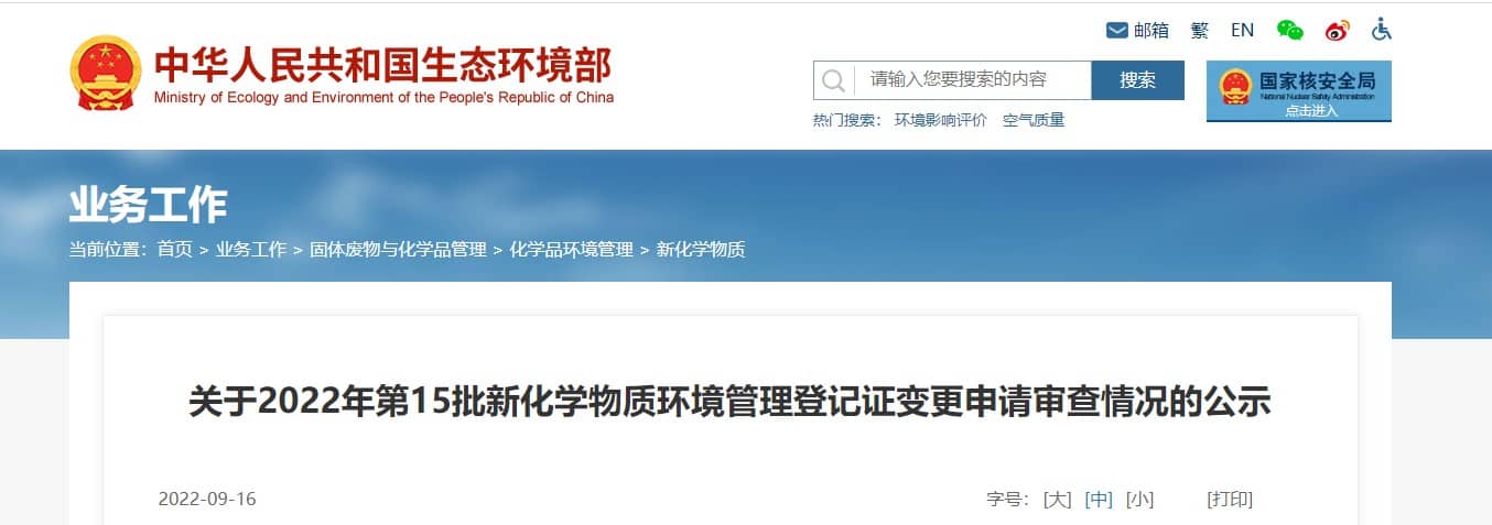 官方發布 | 關于2022年第15批新化學物質環境管理登記證變更申請審查情況的公示