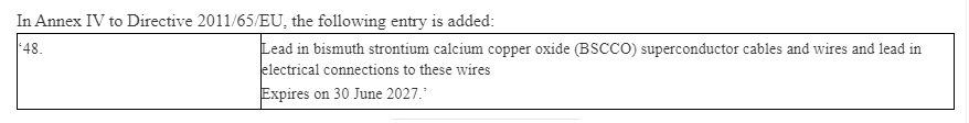 年9月22日,歐盟委員會在其官方公報上發布了指令(EU)  2022/1631和指令(EU)  2022/1632,對歐盟RoHS指令附件IV(即適用于醫療設備及監控設備的豁免)進行了修訂。其中,指令(EU)  2022/1631新增了第48項關于鉍鍶鈣銅氧化物電線中鉛的豁免;指令(EU)  2022/1632在原有第27項豁免的基礎上新增了(c),(d)兩條豁免。指令將于官方公報公布日期后的第20天(2022年10月12日)生效。