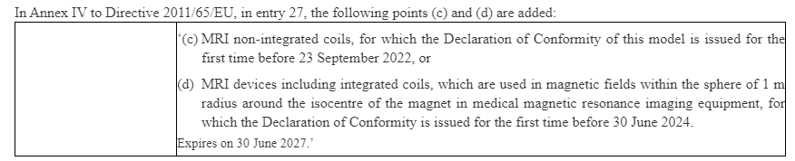 符合性聲明于2022年9月23日前首次發布的MRI非集成線圈,或符合性聲明于2024年6月30日前首次發布的,用于以醫療磁共振成像設備為中心的周圍1m半徑范圍內的磁場的,包括集成線圈在內的MRI設備。