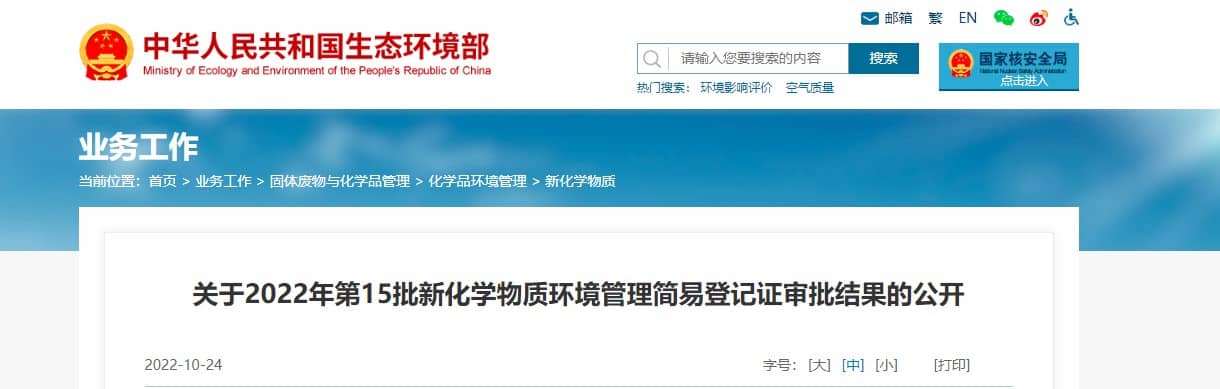 關于2022年第15批新化學物質環境管理簡易登記證審批結果的公開