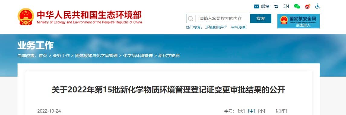 按照《中華人民共和國政府信息公開條例》(國務院令第711號)的要求,現將2022年第15批新化學物質環境管理登記證變更審批結果予以公開。