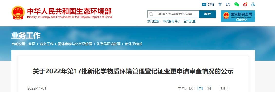 根據《新化學物質環境管理登記辦法》(生態環境部令第12號,以下簡稱《辦法》)、《關于新化學物質環境管理登記有關銜接事項的公告》(生態環境部公告2020年第46號),我部對上海新永紡織染化有限公司等單位的5份新化學物質常規登記證變更申請材料和上海新永紡織染化有限公司等單位的111份簡易登記證變更申請材料進行了審核,符合有關要求,擬批準登記證變更,詳見附表。根據《辦法》第三十條,現將擬批準的新化學物質環境管理登記證變更申請相關情況予以公示。