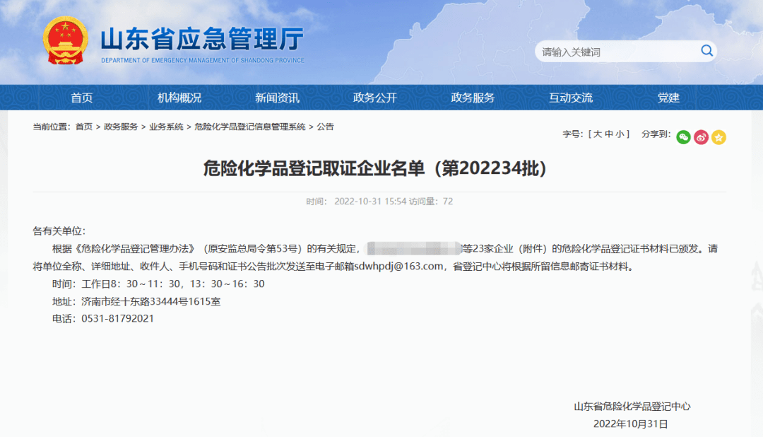 11月1日山東省危險(xiǎn)化學(xué)品登記中心發(fā)布了202234批危險(xiǎn)化學(xué)品登記取證企業(yè)名單。以勒協(xié)助山東某著名日企取得了又一例危化品登記證。