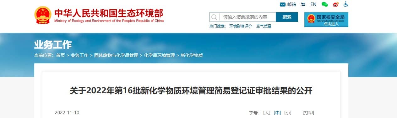 關于2022年第16批新化學物質環境管理簡易登記證審批結果的公開