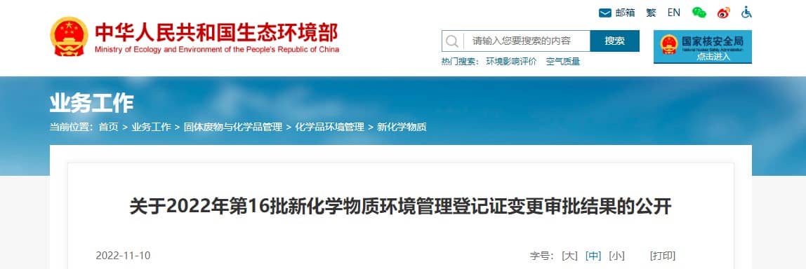 關(guān)于2022年第16批新化學(xué)物質(zhì)環(huán)境管理登記證變更審批結(jié)果的公開