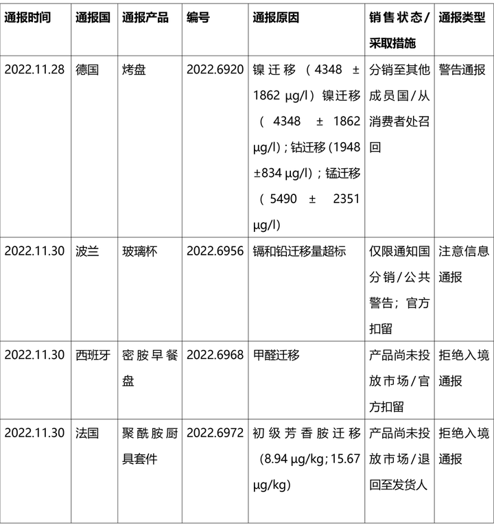 在2022年第48周通報中,歐盟食品和飼料類快速預警系統(RASFF)通報中國食品及相關產品有8例,下圖選取其中4個案例。涉及出口德國、波蘭、西班牙等國,通報原因有初級芳香胺遷移、甲醛遷移等。