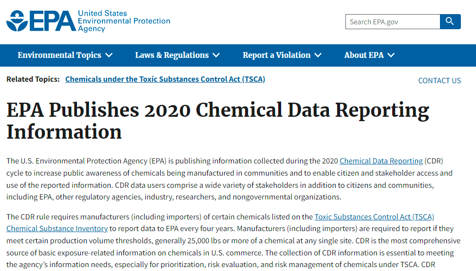 據(jù)美國(guó)EPA官網(wǎng)消息,美國(guó)環(huán)境保護(hù)署(EPA)于2022年5月12日發(fā)布了2020年化學(xué)品數(shù)據(jù)報(bào)告(CDR)周期中收集的信息,以提高公眾對(duì)流通中的化學(xué)品的認(rèn)識(shí),并使公民和利益相關(guān)者能夠獲取和使用報(bào)告的信息。CDR數(shù)據(jù)用戶除了包括公民和社區(qū)之外,還包括各種各樣的利益相關(guān)者,包括EPA,其他監(jiān)管機(jī)構(gòu),行業(yè),研究人員和非政府組織。