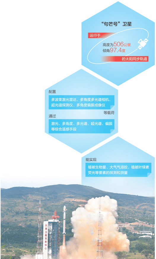 中國航天科技集團五院遙感衛星總體部“句芒號”衛星總設計師曹海翊介紹,“句芒號”衛星是國家民用空間基礎設施中長期發展規劃中的科研衛星,運行于高度為506公里、傾角97.4度的太陽同步軌道。通過激光、多角度、多光譜、超光譜、偏振等綜合遙感手段,能實現植被生物量、大氣氣溶膠、植被葉綠素熒光等要素的探測和測量。